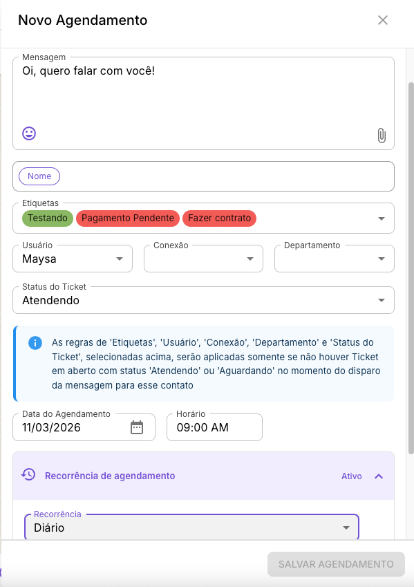 O agendamento recorrente é quando a mensagem se repete automaticamente com uma frequência definida, por exemplo:
