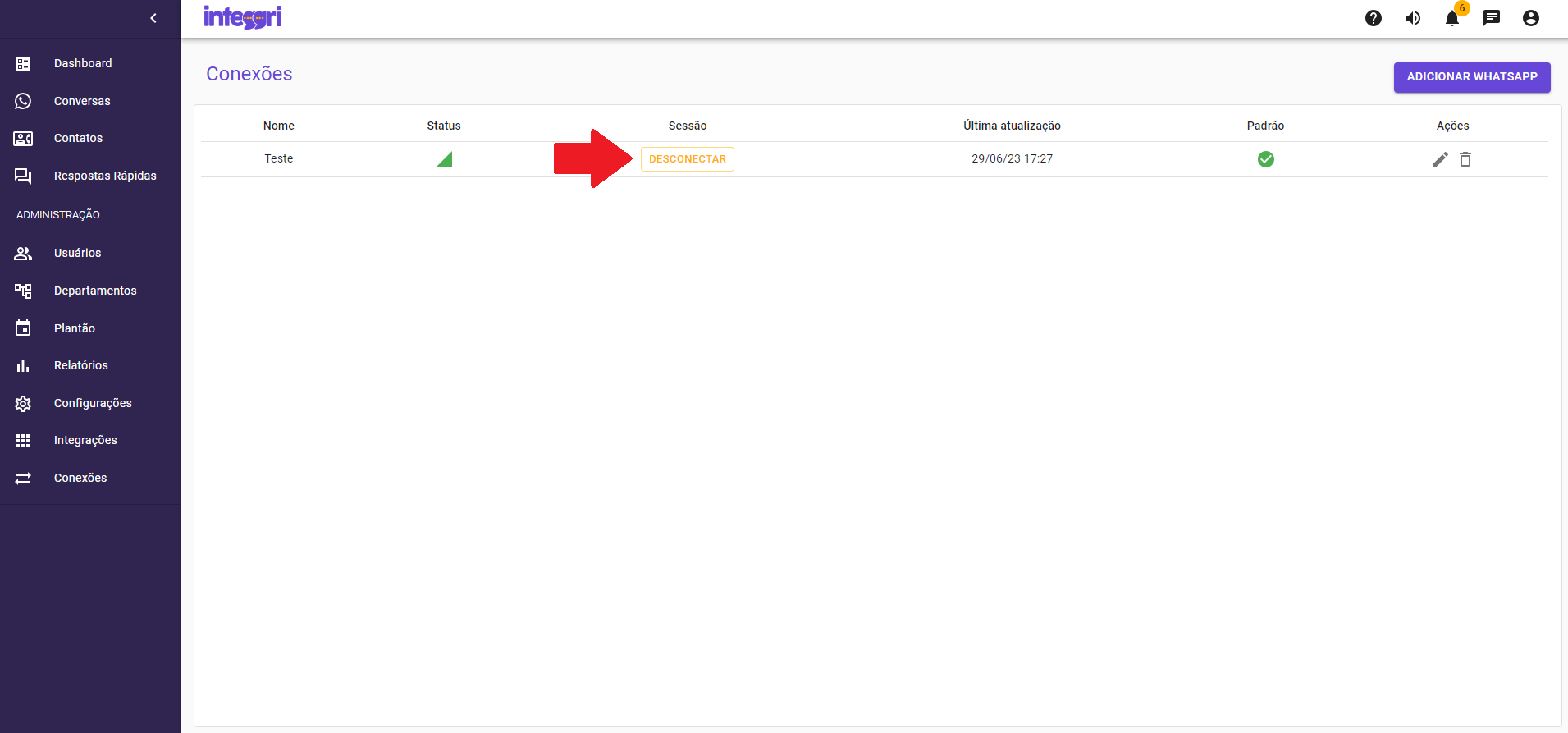Na plataforma da Integgri, ao lado esquerdo clique em “conexões” e em seguida clique no botão “desconectar” o WhatsApp.