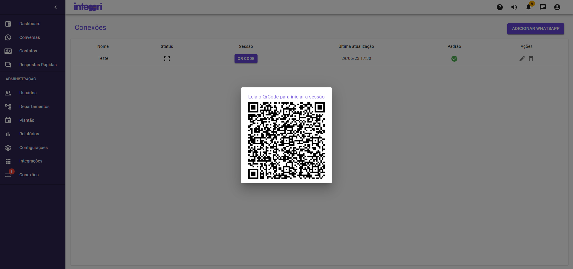 Após isso, faça novamente a conexão do WhatsApp na plataforma, indo novamente na aba “conexões”, depois em “adicionar” e escanear o QR CODE na tela para conexão.